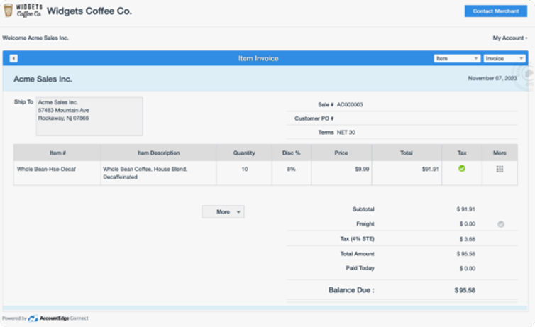 - Invoicing and Payment Processing - Customers can make full or partial credit‑card payments through the AccountEdge Connect customer portal using Web Pay. Square Payments can also be imported directly.