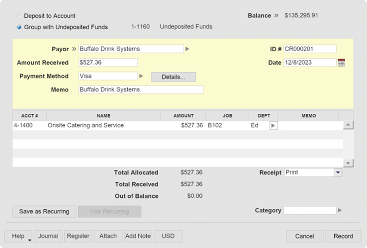 - Record payments, receipts, deposits, adjustments, and transfers (one‑time or recurring).