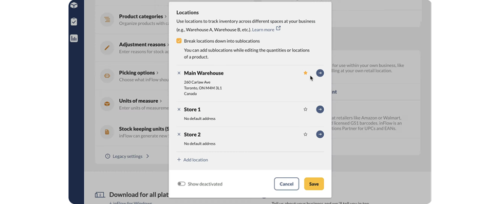 With inFlow, you will easily see which of your products are in stock, which aisle or bin they're in, and whether they're reserved. Whether you keep products in a back room or a 20,000 square-foot warehouse, you'll have the tools you need to track inventory from location to location. You can even connect to your eCommerce platforms (like Amazon, BigCommerce, eBay, Etsy, Magento, Shopify, and 30+ others) to automate more of your work.