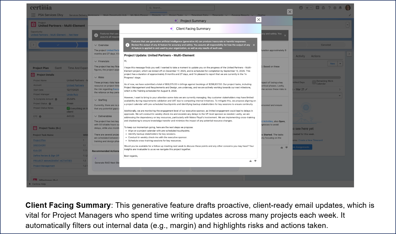For project managers, on-demand summaries across project financials, staffing, risks, and deliverables eliminate the administrative overhead that consumes delivery time, returning up to 20 hours per month.
