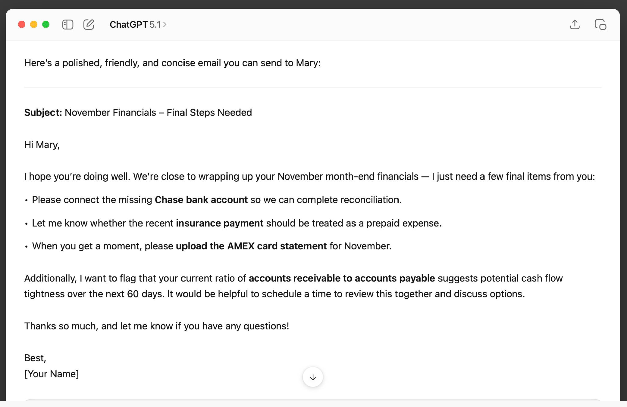 The classic example of ChatGPT's use was writing emails. Let's write a client email. I'm going through the month-end close. I'm taking some notes and bullets, and here's the question. I've told it, "You're a friendly, helpful, knowledgeable accountant, and please draft this into an email." Jeff then pointed out one thing before he showed the results.