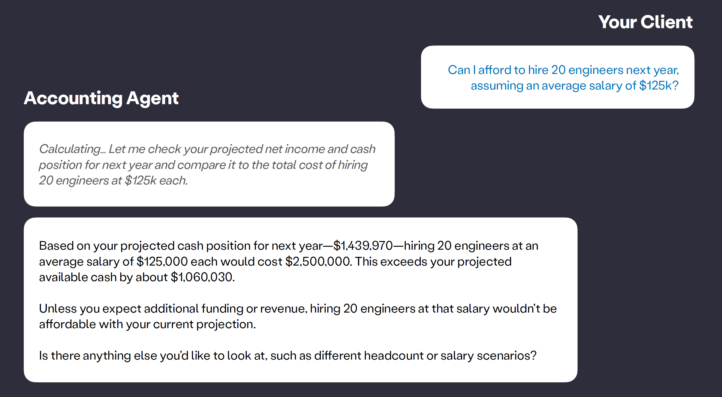 Jeff then discussed AI agents, focusing on a specific example: "Can I afford to hire 20 engineers next year?" An agent can assess your ability to afford this by calculating engineer salaries against your net income. It might respond, "I'm sorry, but you can't hire 20 engineers; however, you could afford 10."
