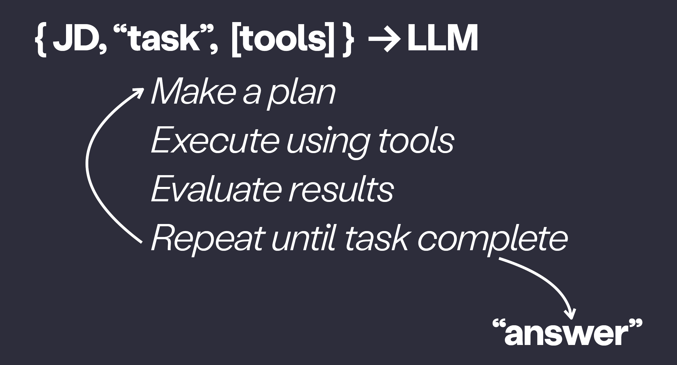 The agent processes the input and uses various tools, including traditional programs that it can access. Those tools allow it to look up financial information, run profit-and-loss statements, or calculate hiring costs. The job description instructs the agent to create a plan, evaluate outcomes, and determine success. If the task is not completed, the agent revisits the steps until it arrives at a satisfactory answer, which it then presents.