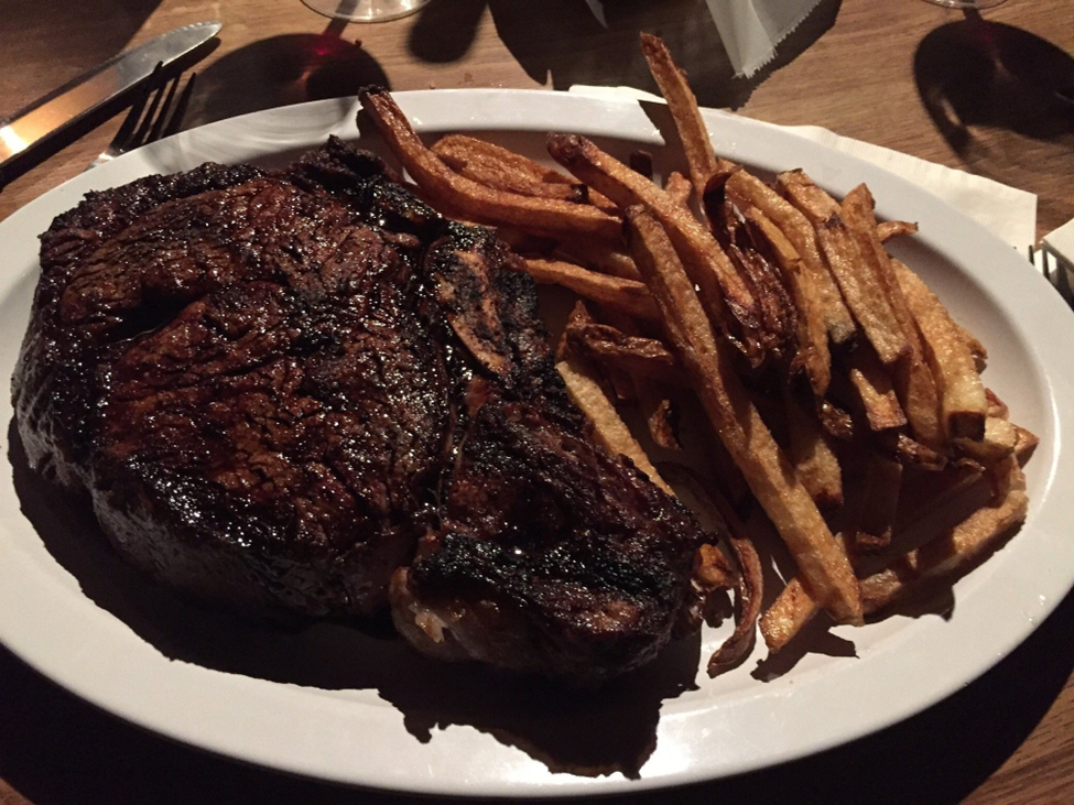 Looks almost like the Old Court and Lockup. But it's actually rated among the best places for a "good old dinner." And speaking of 'good', how does my Bone-in Ribeye Steak and French Fries look?