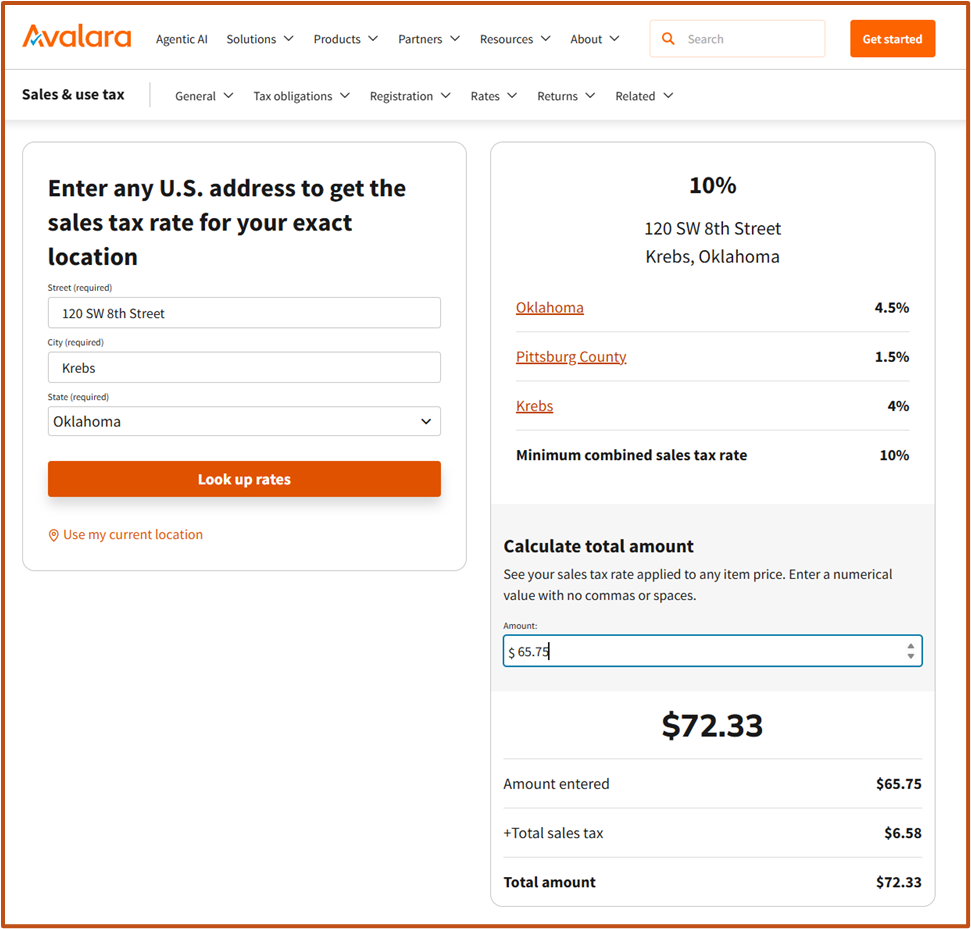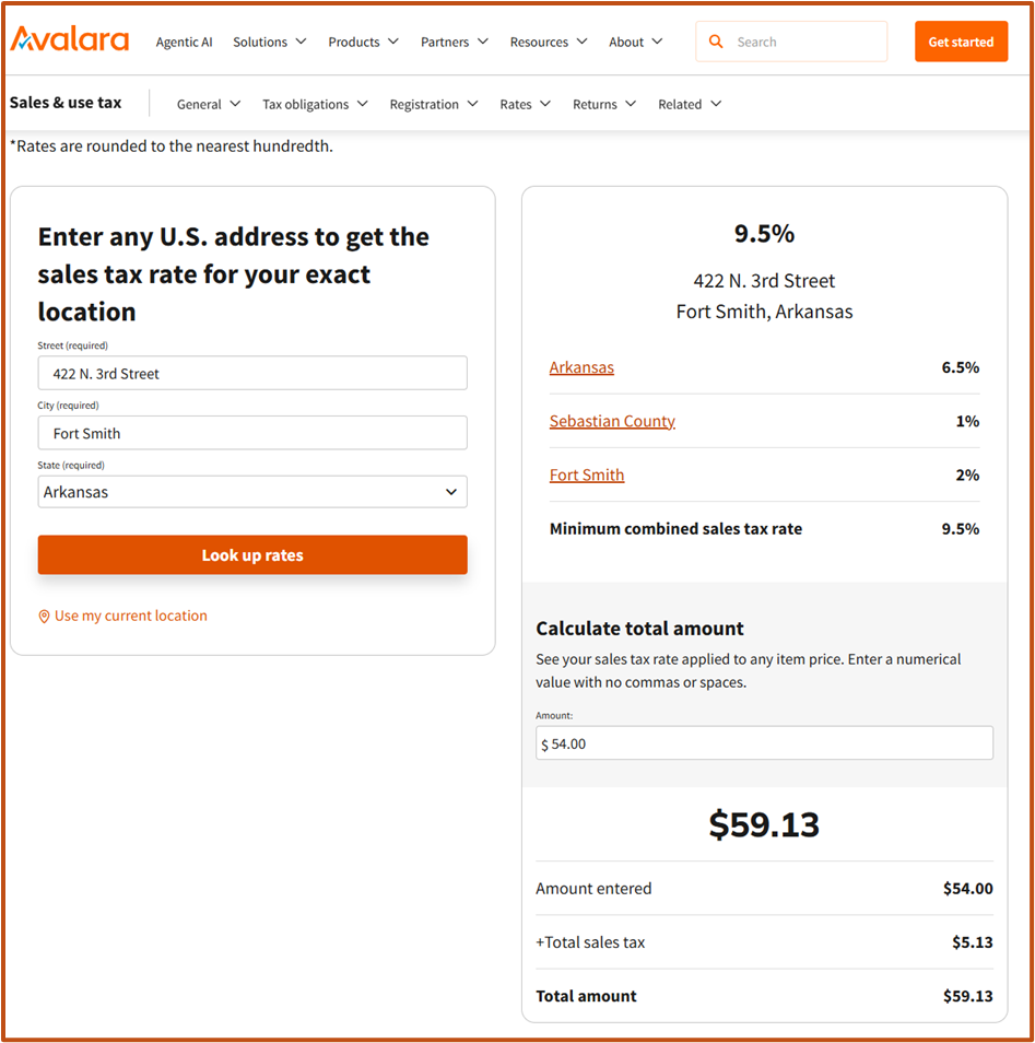 Since we split our steak and fries, a small order of tamales with chili, cheese, and onions, and a couple of iced teas, our pre-tax tab was $54.00. Avalara tells us the sales tax for this part of Fort Smith is a combined rate of 9.5% (6.5% Arkansas State Sales Tax, 1.0% Sebastian County Sales Tax, and 2.0% Fort Smith Sales Tax). That's $5.13 in sales tax for a total bill of $59.13 (see the Avalara calculator below).