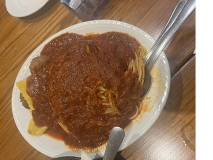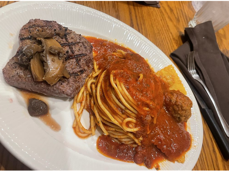 For dinner, we are going to split the steak and lamb fries, which come with Pete's spaghetti, meatballs, ravioli, salad, antipasto, and garlic bread. We will also order an extra Italian dinner, which includes all the side dishes as a meal in itself; that way, there will be plenty to eat.