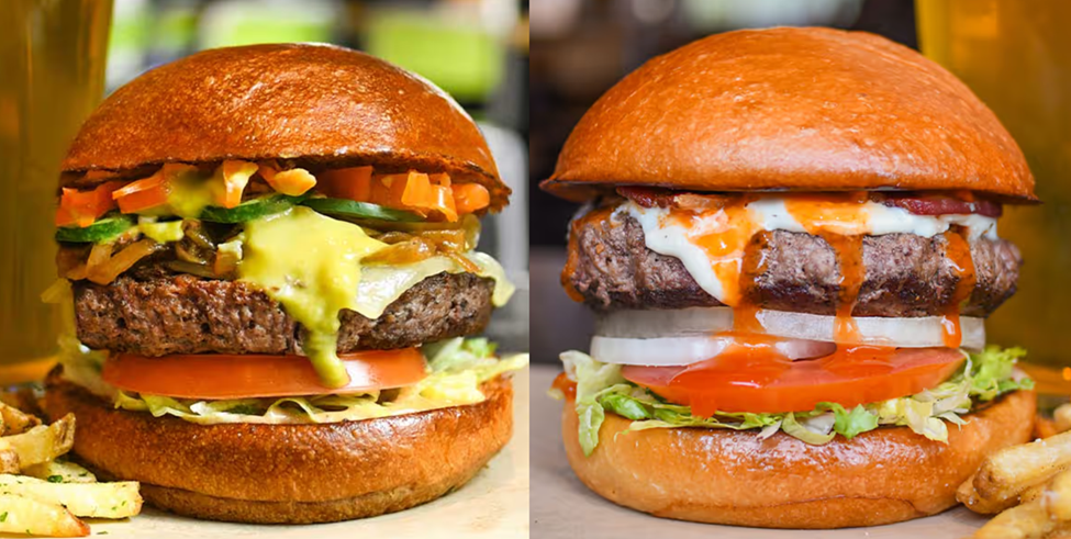 After a bloody story like that, how does a rare Buffalo Burger sound? While you might have heard the place to go is the Lonesome Dove, that's way too fancy for real cowboys and cowgirls. We’re headed over to Forth Worth's Hopdaddy Burger Bar. As for me, I'm having a Bison El Diablo burger featuring a 1/2-pound grass-fed, pasture-raised bison meat patty, Tillamook pepper jack cheese, jalapeños and habaneros, caramelized onions, spicy salsa verde, chipotle aioli, lettuce and tomato. Well, my companion is a bit of a sissy, so she is having a Buffalo Bill Burger: a single bison patty, blue cheese spread, bacon slices, buffalo sauce, and lettuce, tomato, and onion.
