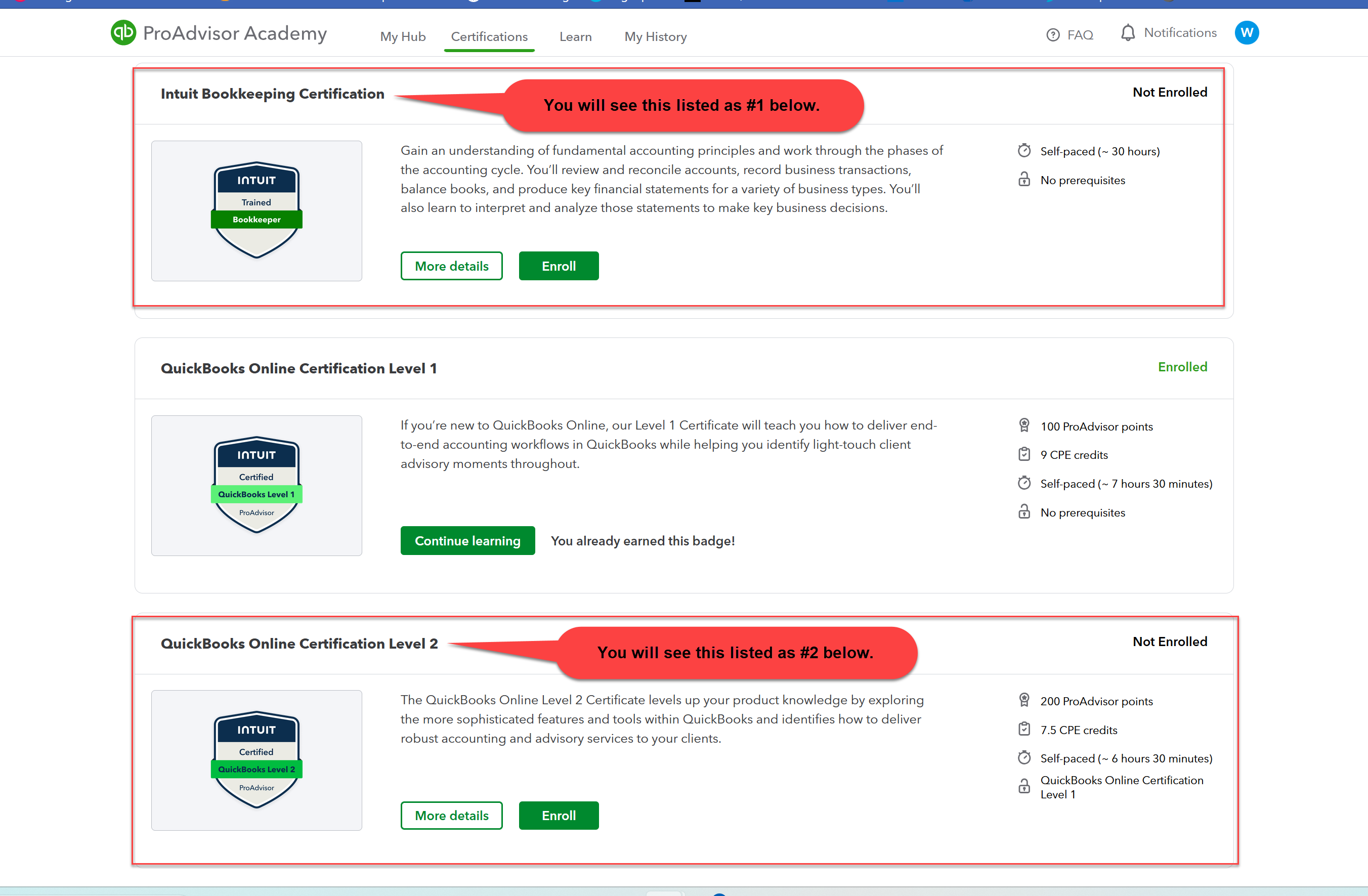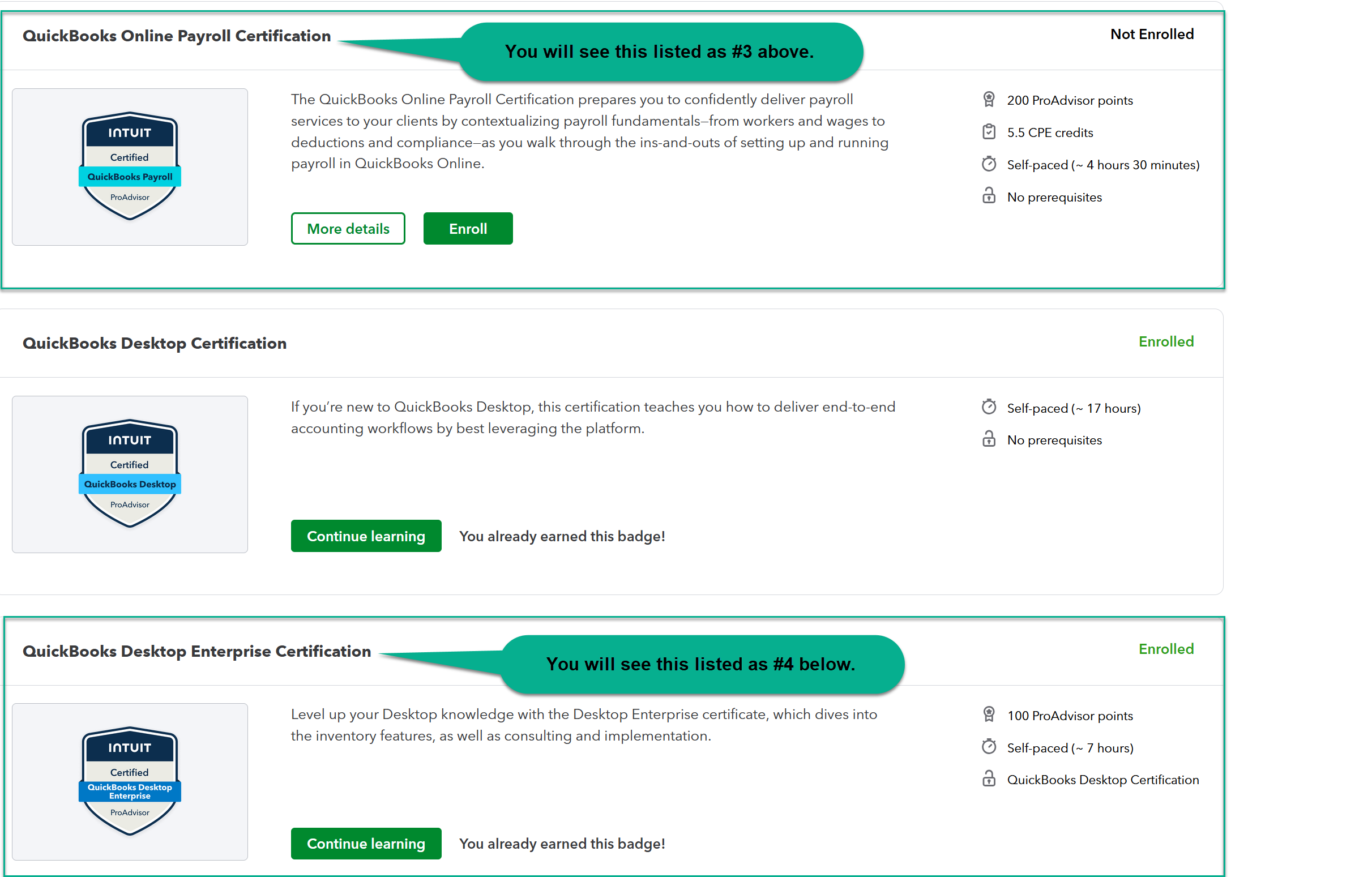 Note in the above examples, we used four Intuit 'self-pace certification trainings', all of which are composed of multiple modules or courses (which you can take individually). We did not report the various modules/courses/sessions individually, but collectively as part of each Certification preparation course.