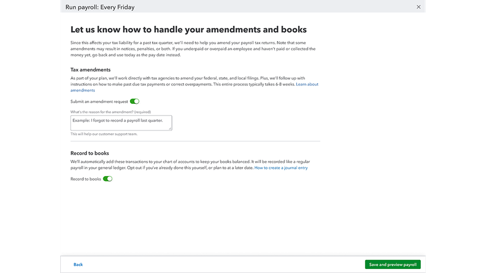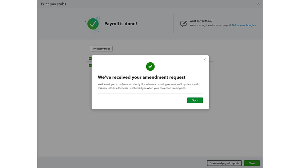 You should always make all necessary corrections for a pay period before you initiate any tax liability amendment. Core, Premium, and Elite QBO Payroll subscriptions support the making of such corrections; however, only Premium and Elite subscribers with ‘automated taxes and forms’ active have an option for amendments to be done for them by Intuit.