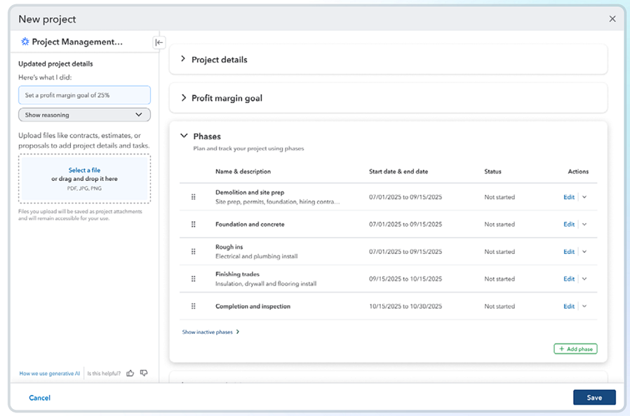 A major enhancement is AIA-style invoicing, allowing contractors to bill using standard formats that show contract value, work completed, previously invoiced amounts, current charges, and remaining balances by phase.