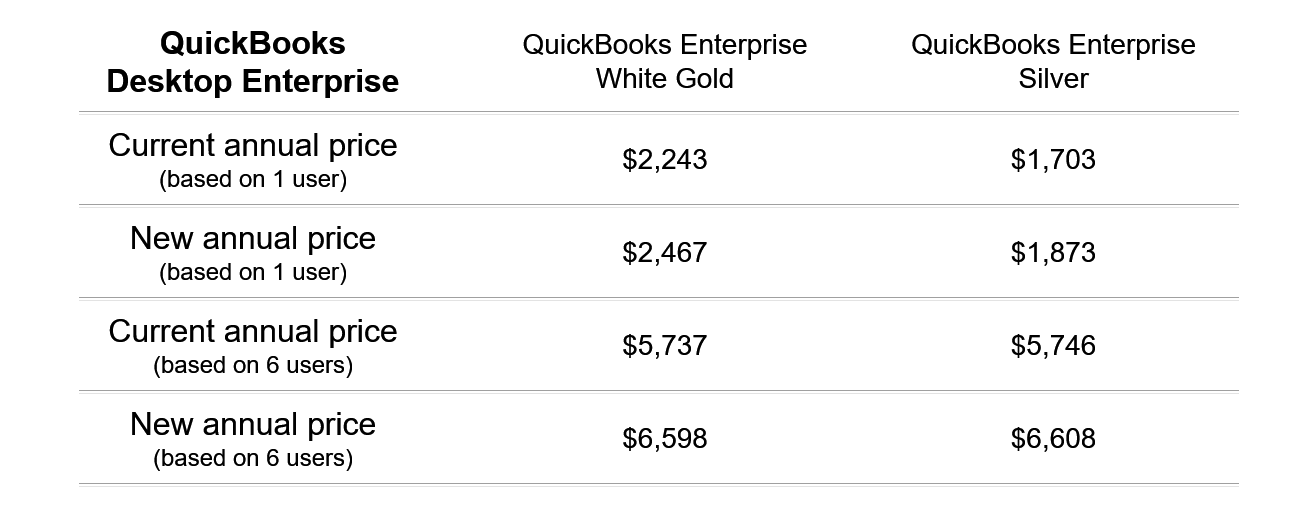 Intuit has just announced that they will continue to support renewals of QuickBooks Desktop Enterprise subscriptions for subscribers with renewal dates after February 2026, and that such renewals will be subject to price adjustments1. In the table below, 'Current price' reflects subscriptions prices prior to February 1, 2026. Effective February 1, 2026 , QuickBooks Desktop Enterprise Silver and QuickBooks Desktop Enterprise White Gold subscriptions renewing will be subject to the 'New Price' shown in the table. (Price change applies to all user tiers).