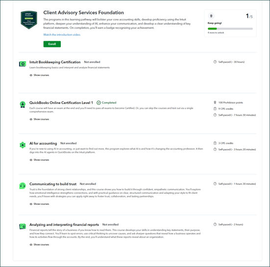 - Offering a new Client Advisory Services (CAS) training curriculum that's been designed to equip firms with the skills needed to deliver strategic insights to their clients. The new Client Advisory Services Foundation curriculum encompasses the Intuit Bookkeeping Certification, QuickBooks Online Certification Level 1, the new AI for Accounting course, a new course on Communicating and building trust, and another new course offering: Analyzing and interpreting financial reports.