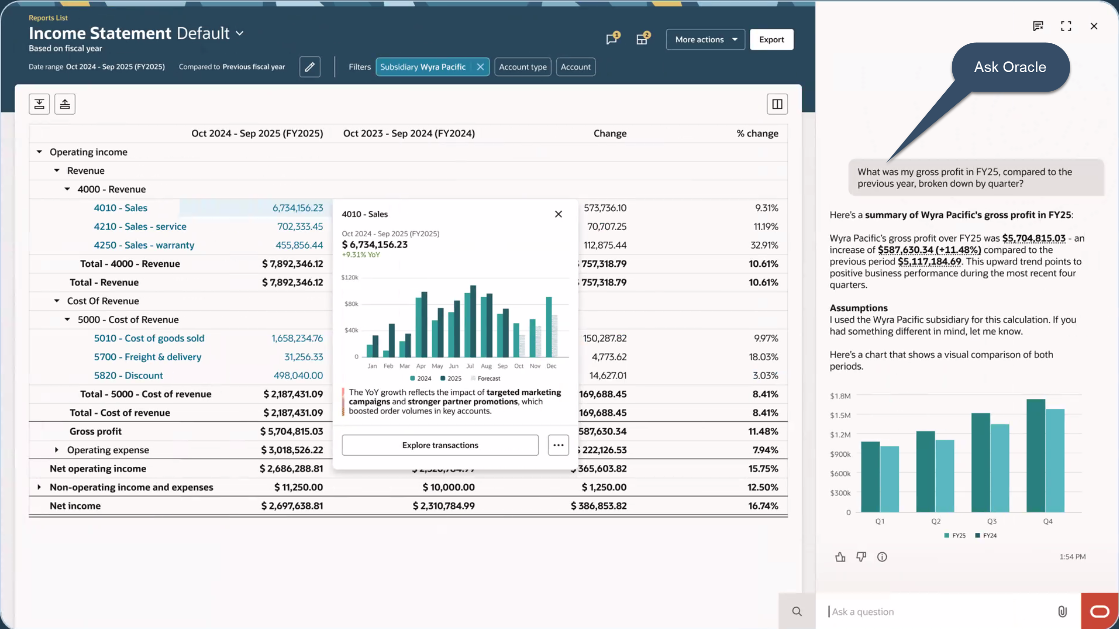 It delivers context-aware answers, visualizations, interactive content, and reasoning that explains the “how” and “why” behind every response and enables users to more easily collaborate with NetSuite. In addition, Ask Oracle acts across customizations and extensions built on the SuiteCloud Platform, including partner applications available in the SuiteCloud Developer Network, to provide a seamless experience and contextual insight across the suite.