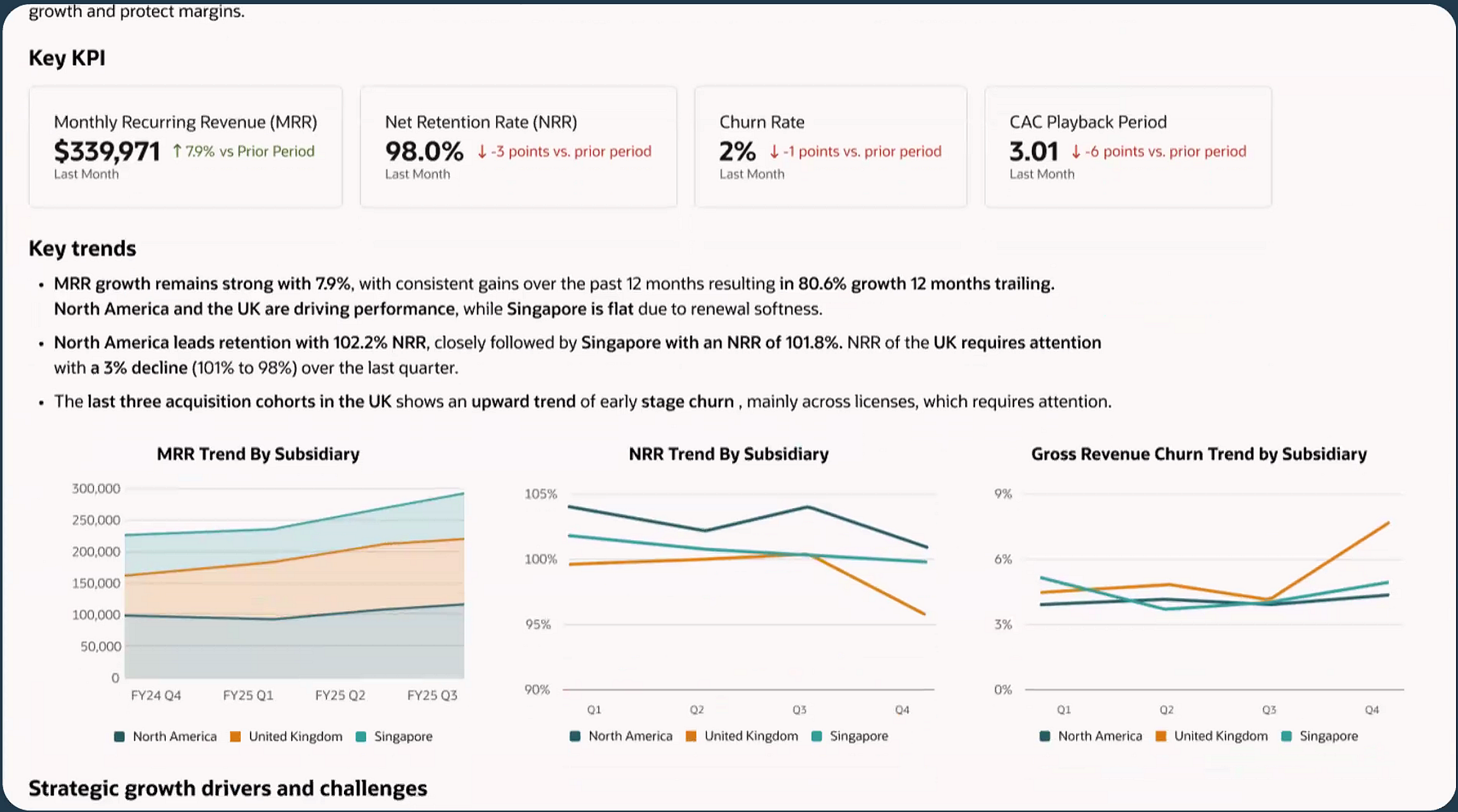 - Narrative summaries and insights: Automated explanations, available in record forms, reports, and other pages across the suite. The narrative summaries and insights feature proactively surfaces correlations and trends from NetSuite’s unified data model so users can spot opportunities and risks before they become issues.