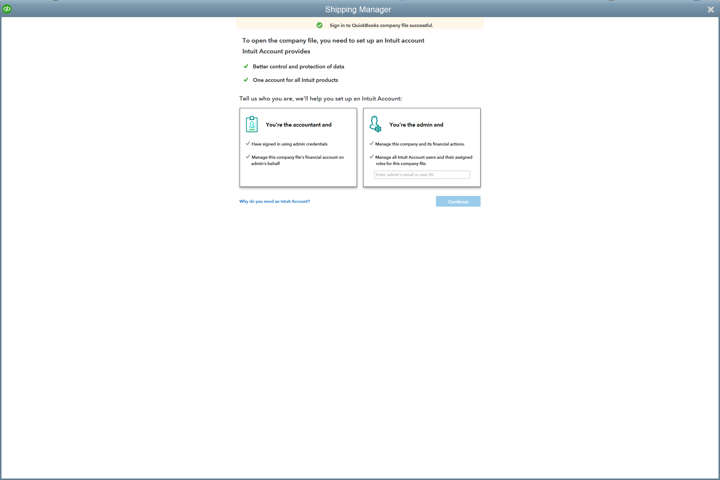 To use this new Shipping Manager, you need to update to the 2024 version of QuickBooks Desktop. You must also be able to log in to your Intuit account. Enter the Master Admin (MMA) credentials for the company file realm.