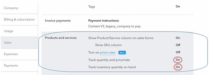 - Turn on Track quantity and price/rate and Track inventory quantity on hand
