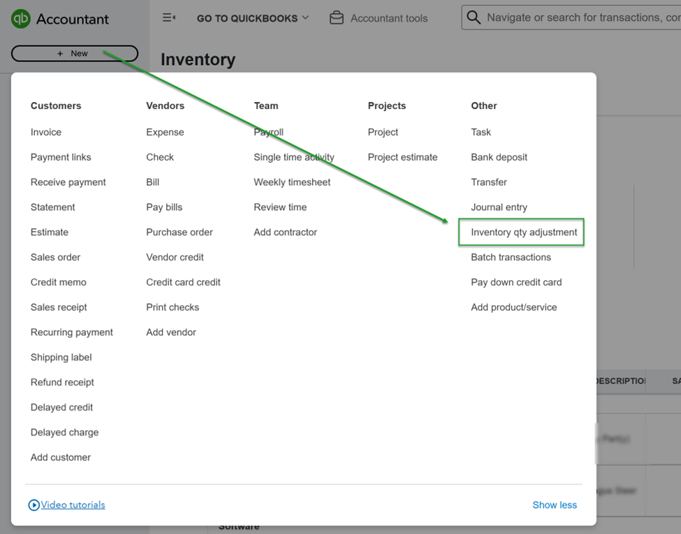 - Select Inventory qty adjustment. (Note: If you want to adjust multiple items’ quantities, select Batch actions in Products and services.)