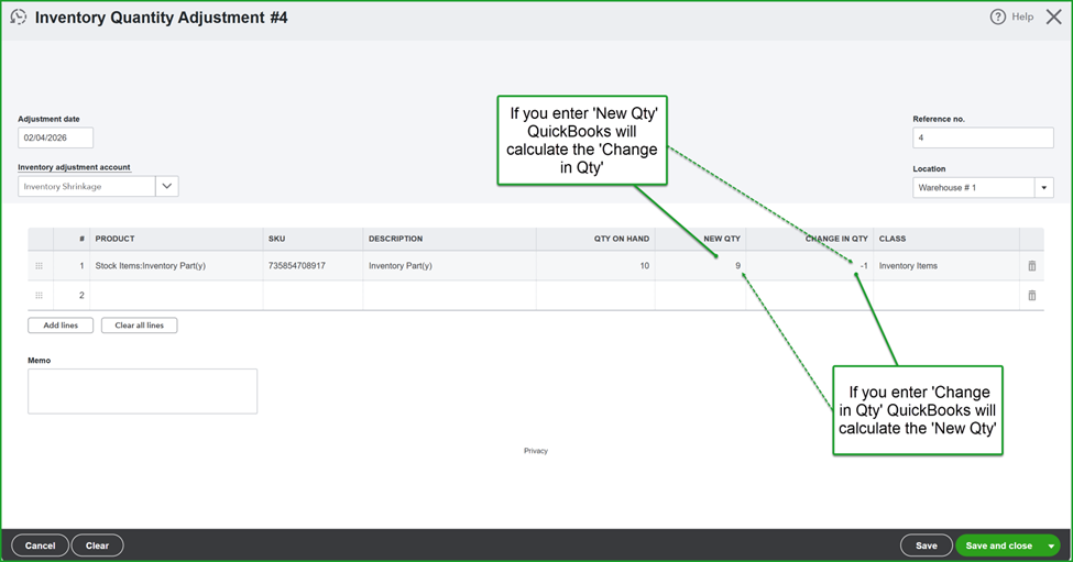 - In the Memo field, enter the details about the adjustment.