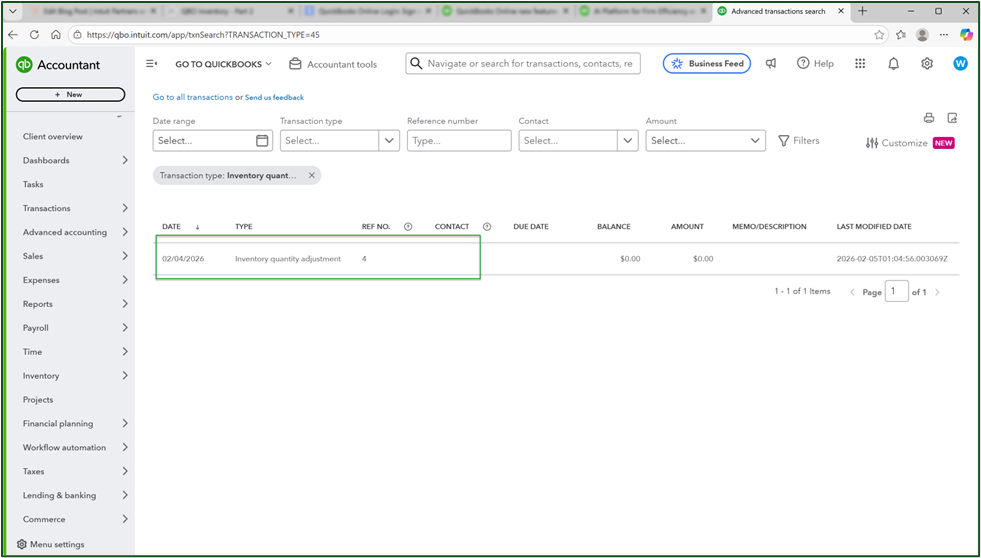 - From the All Transactions dropdown, select Inventory Quantity Adjustment.