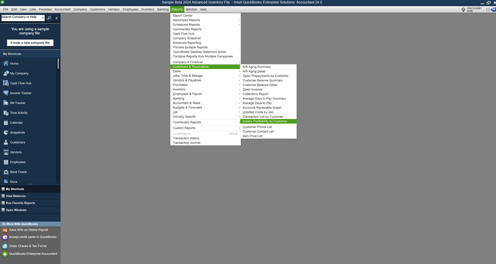 The Report can be accessed from the Reports menu, then choose Customers & Receivable, and then select Invoice Profitability by Customer. Depending on your requirements, you may need to Customize (the) Report. This Report enables you to sort customers and invoices by profitability, allowing for efficient review of customer-level performance.