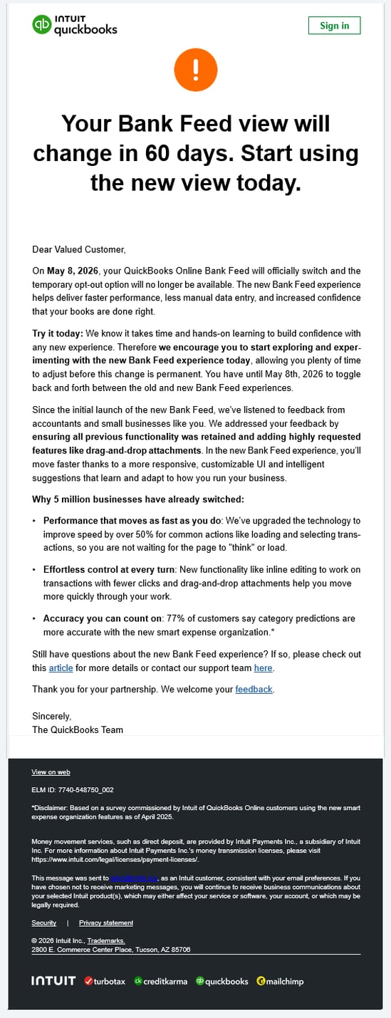 Intuit previously rolled out changes to Bank Feeds in QBO but gave users the option to continue with the previous version, that option ends May 8, 2026.