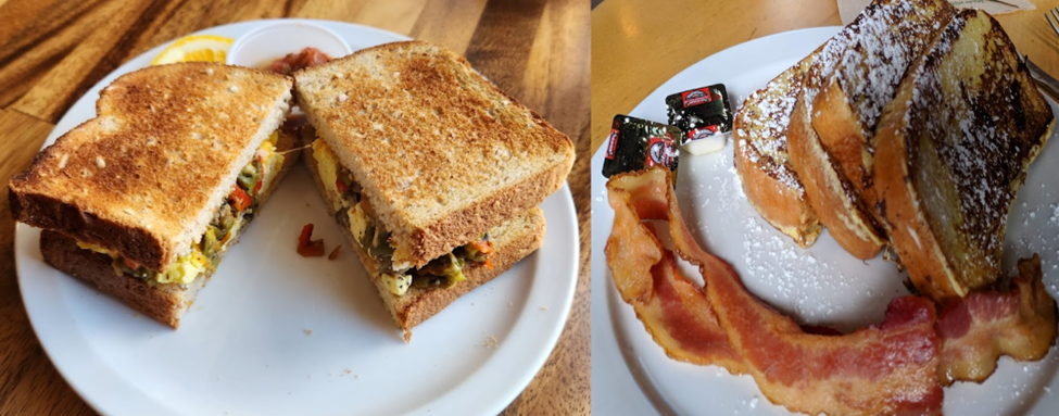 The breakfast 'toaster' sandwich was delicious, and so was the French toast with bacon.